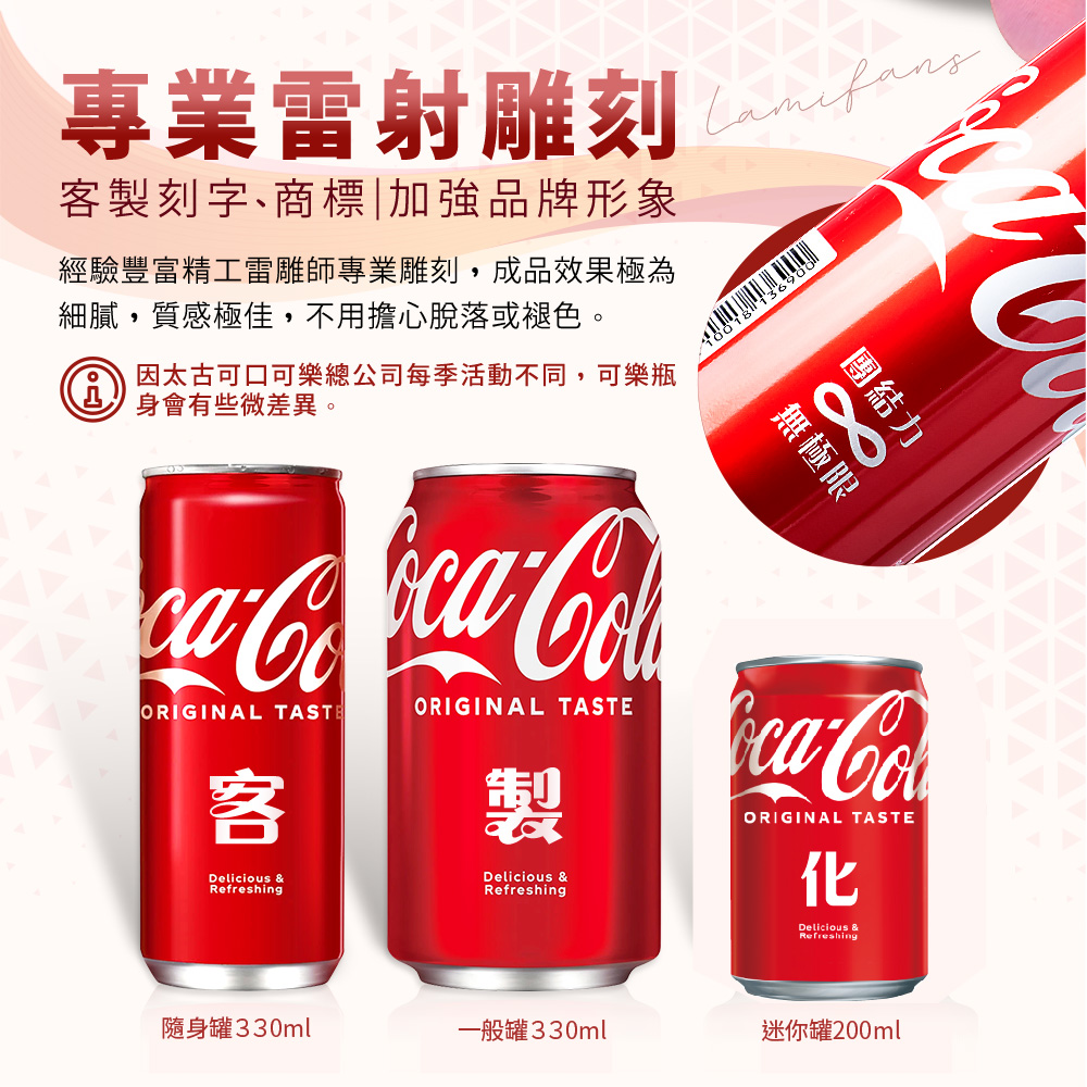 Q:飲料是可以喝的嗎? A:可以,都是與市售量販飲料相同, 製造日期都是最新的,只是瓶身雷雕文字,喝完可以留念唷。 本頁面飲料皆購於台灣本地量販店 可樂瓶身因太古可口可樂總公司每季活動不同,瓶身會有些微差異。